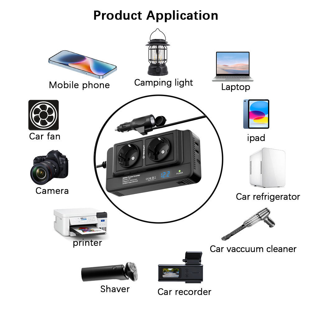 • Whether you are on a family trip or a business trip, the inverter becomes the perfect partner to keep all devices charged and ready to use.