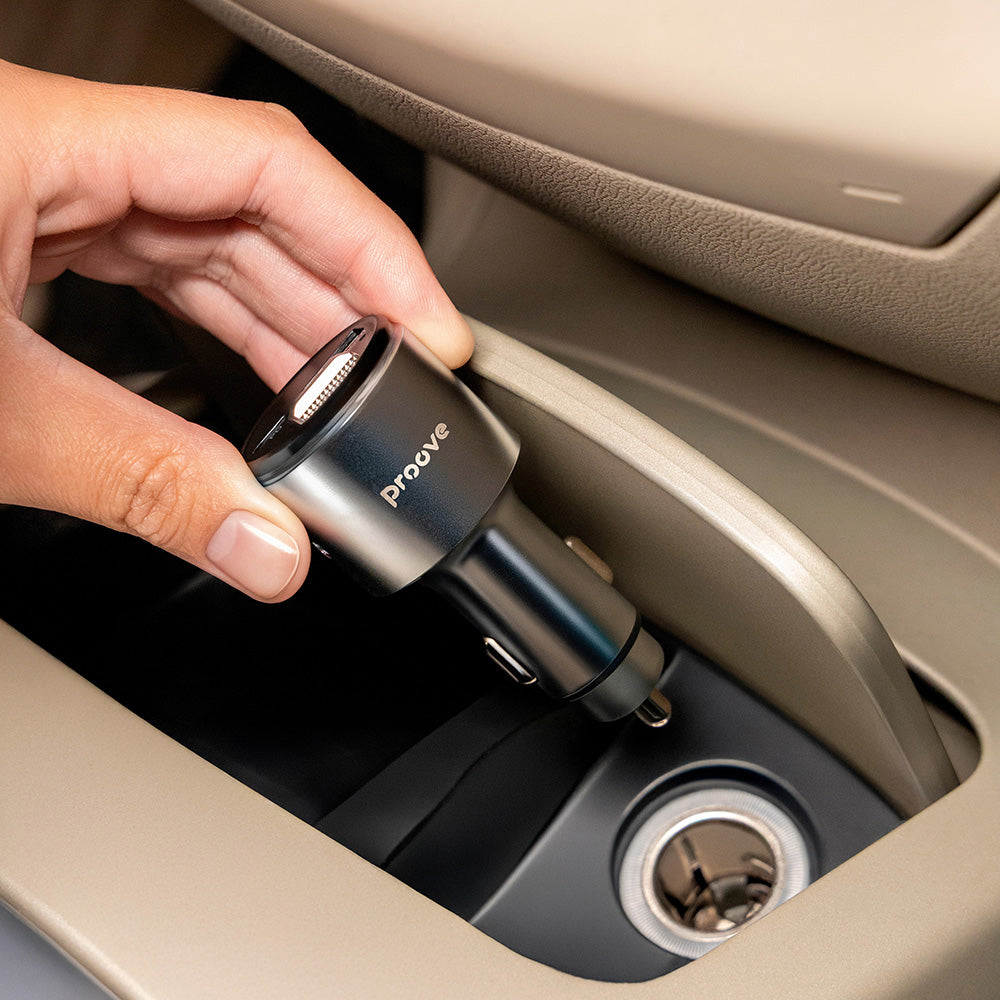 Enjoy your favorite music while driving and charging your phone. Order the FM modulator with Type-C, USB premium charger function. Connect your phone to the car radio Now it's simple. All you need to do is purchase this RGB light Bluetooth FM modulator. Not only does it facilitate device connection, but it also features a unique design. Music and good vibes Set the radio frequency to 85.7FM and listen to your favorite songs. Long drives will no longer be boring with the Proove modulator and car charger. Specifications: Material: aluminum; Ports: USB, Type-C, Jack 3.5mm; Bluetooth Version: V.5.3; Bluetooth Range: 10m; Input voltage: 12-24V; USB output current: 5V/3A, 9V/2A, 12V/1.5A; Type-C output: 5V/3A, 9V/3A, 12V/2.5A; USB Power: 18W; Type-C Power: 30W; Total Power: 30W; Audio: WMA, MP3, WAV, APE, FLAC; Frequency: 87.5-108MHz; Compatibility: iOS, Android; Dimensions: 82 x 35 x 35mm; Weight: 73g.
