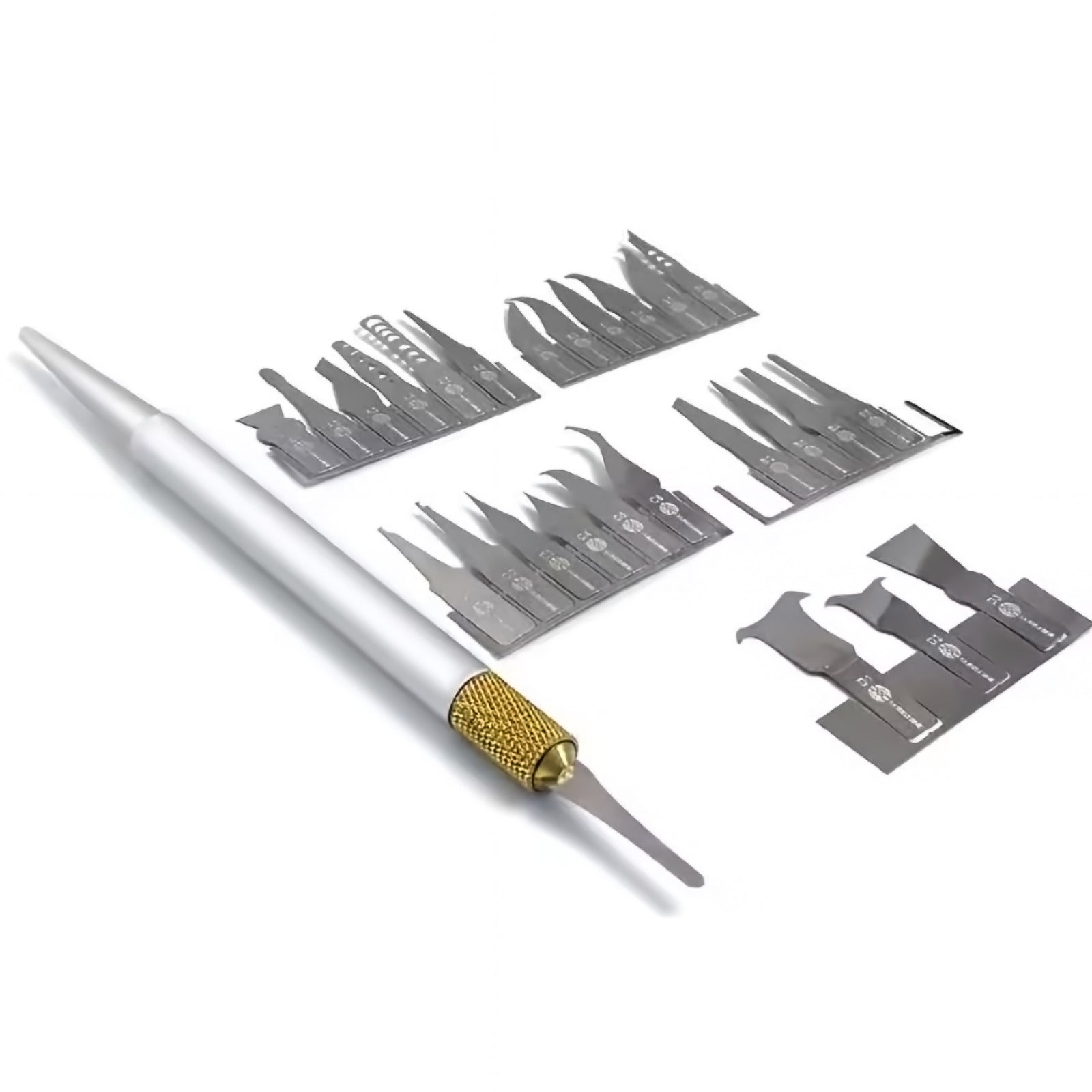 from mobile phone motherboards. The set includes 27 ultra-thin blades and an ergonomic pen-shaped handle,
