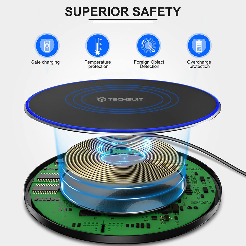 • You've found the right one for you. The Techsuit wireless charger quickly powers your devices. Enjoy all the benefits offered. The Qi wireless charger is just a click away.