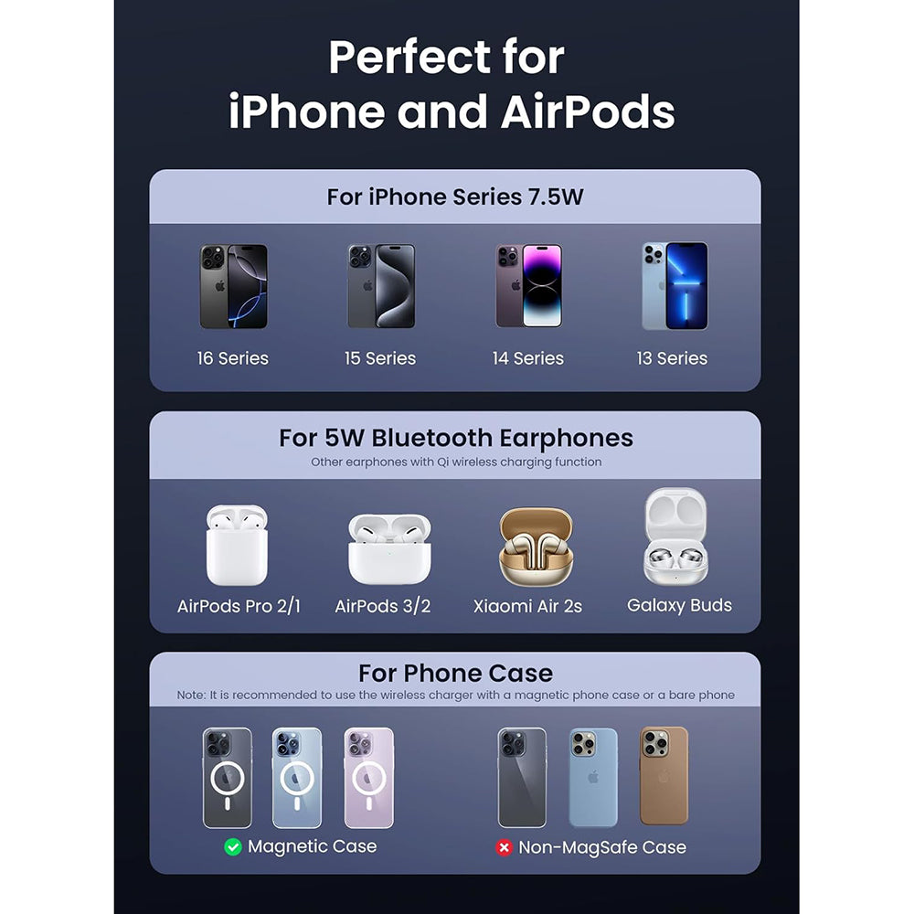 - Compatibility: iPhone 12-16, AirPods 2/3/Pro, Qi-compatible devices