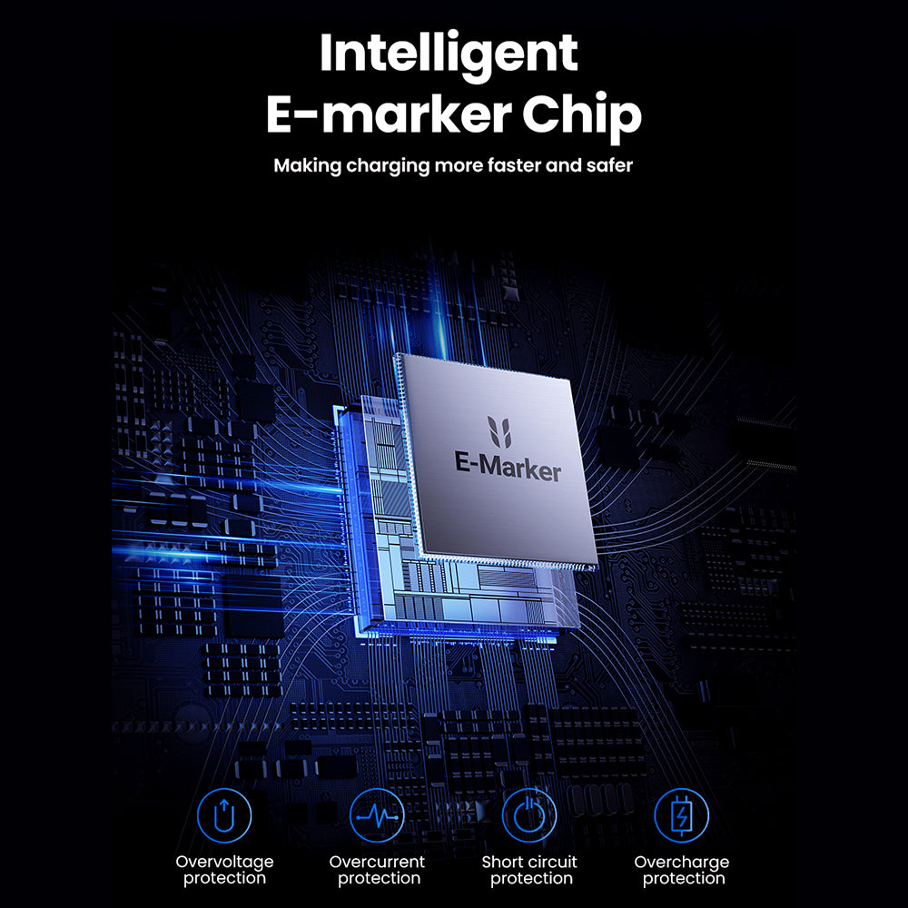 60 minutes - 2.5 times faster than standard cables. The intelligent E-marker chip automatically adjusts voltage and current for device safety, preventing